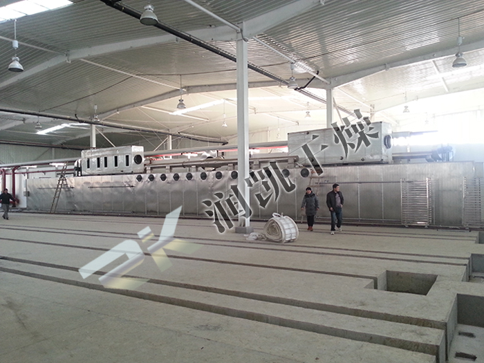 烘干采用連續(xù)式隧道烘干設(shè)備,通過蒸汽加熱空氣,熱風箱內(nèi)循環(huán)烘干物料,尾氣送入冷凝回收裝置進行降溫處理,將汽化的花露冷凝回收。